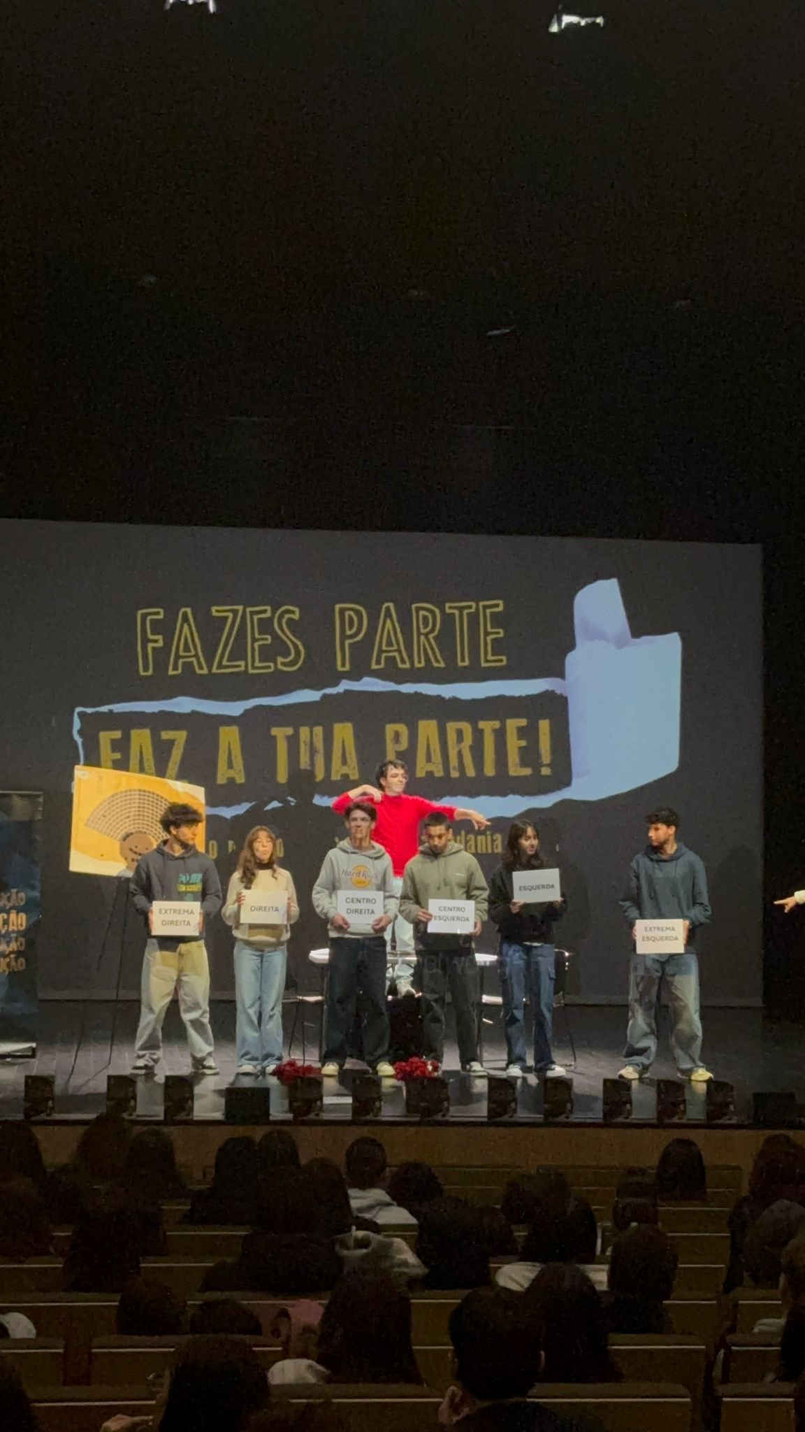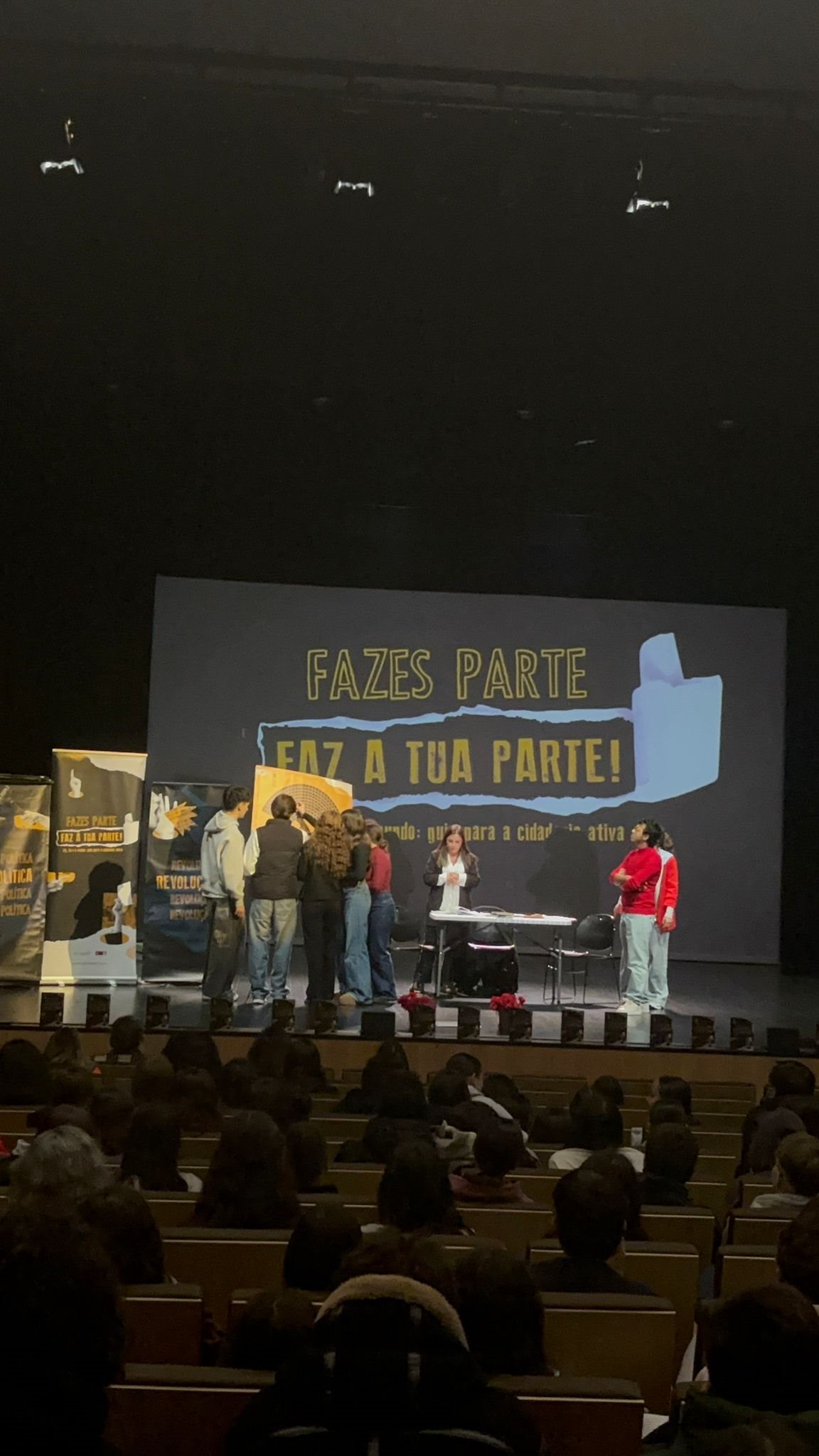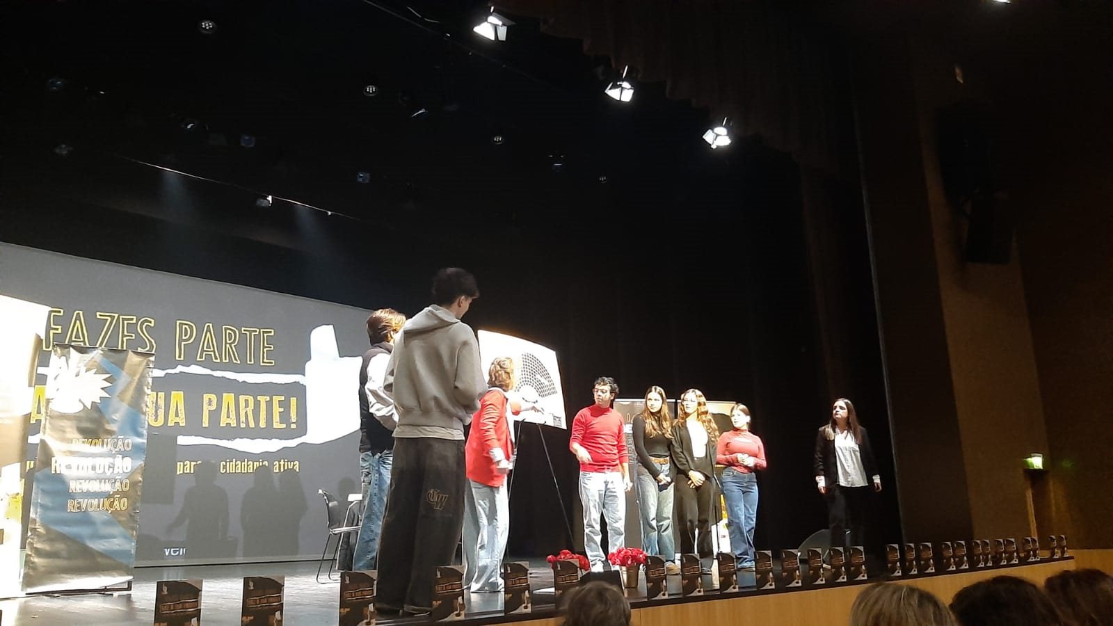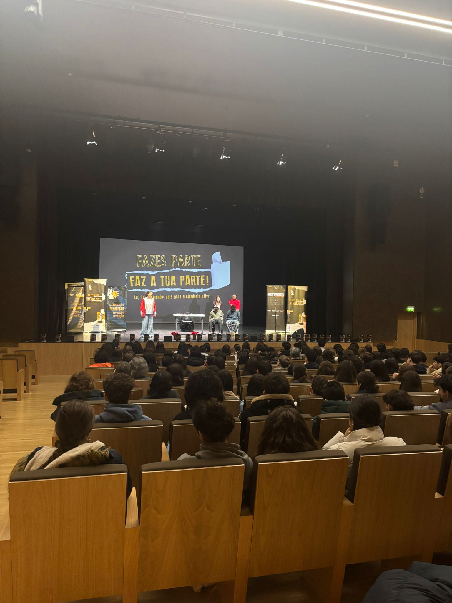 Ao longo de 50 minutos, os/as alunos/as tiveram a oportunidade de assistir e participar num espetáculo que uniu teatro e música ao vivo, conduzindo-os numa viagem pela história da cidadania em Portugal — da ditadura Salazarista ao 25 de Abril de 1974 — até às decisões e responsabilidades do presente.